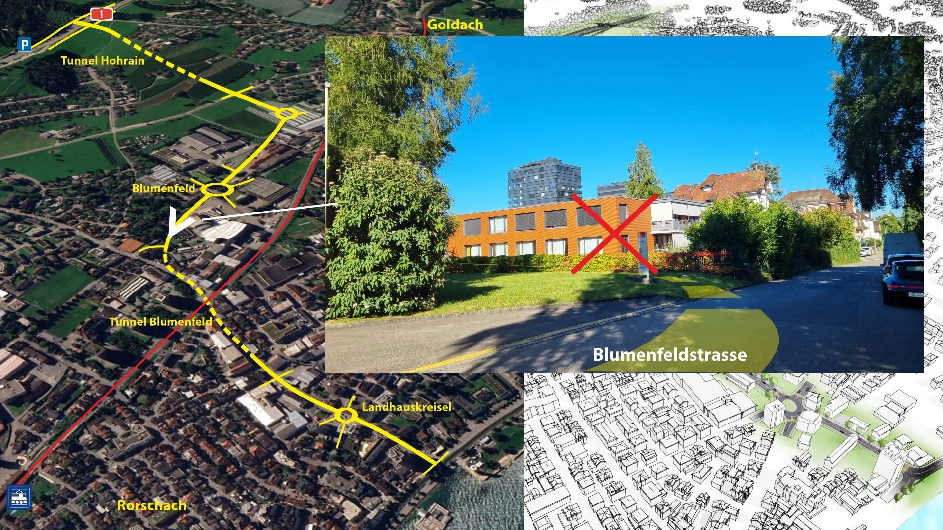 Auf den ersten Blick löst das Projekt in Goldach und Rorschach verkehrliche Probleme der Stadt am See, wie die fehlende Bahnunterführung oder die schlechte Anbindung der Industrie an die Autobahn. Versprochen werden Entlastungen auf den bisherigen Hauptachsen in Goldach und Rorschach sowie Folgeprojekte für Quartiere und den Fuss- und Veloverkehr. Geworben wird mit üppig begrünten Zeichnungen, auf denen viel Grün und grosse Bäume entlang der neuen Strasse zu sehen sind (siehe Visualisierung oben).