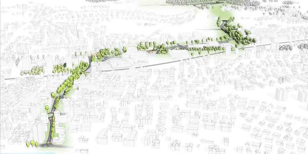 So wird der Autobahnzubringer verkauft: Ein Grünkorridor, der sich durch mehrere Gemeinden zieht. Davon darf man sich aber nicht täuschen lassen (Visualisierung: offizielle Projektskizze).